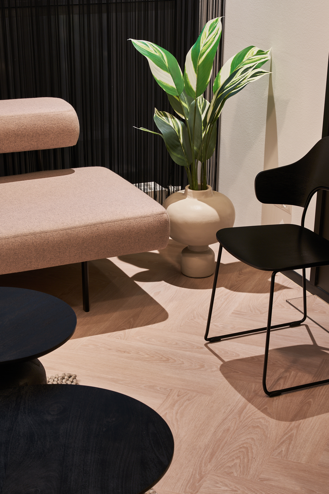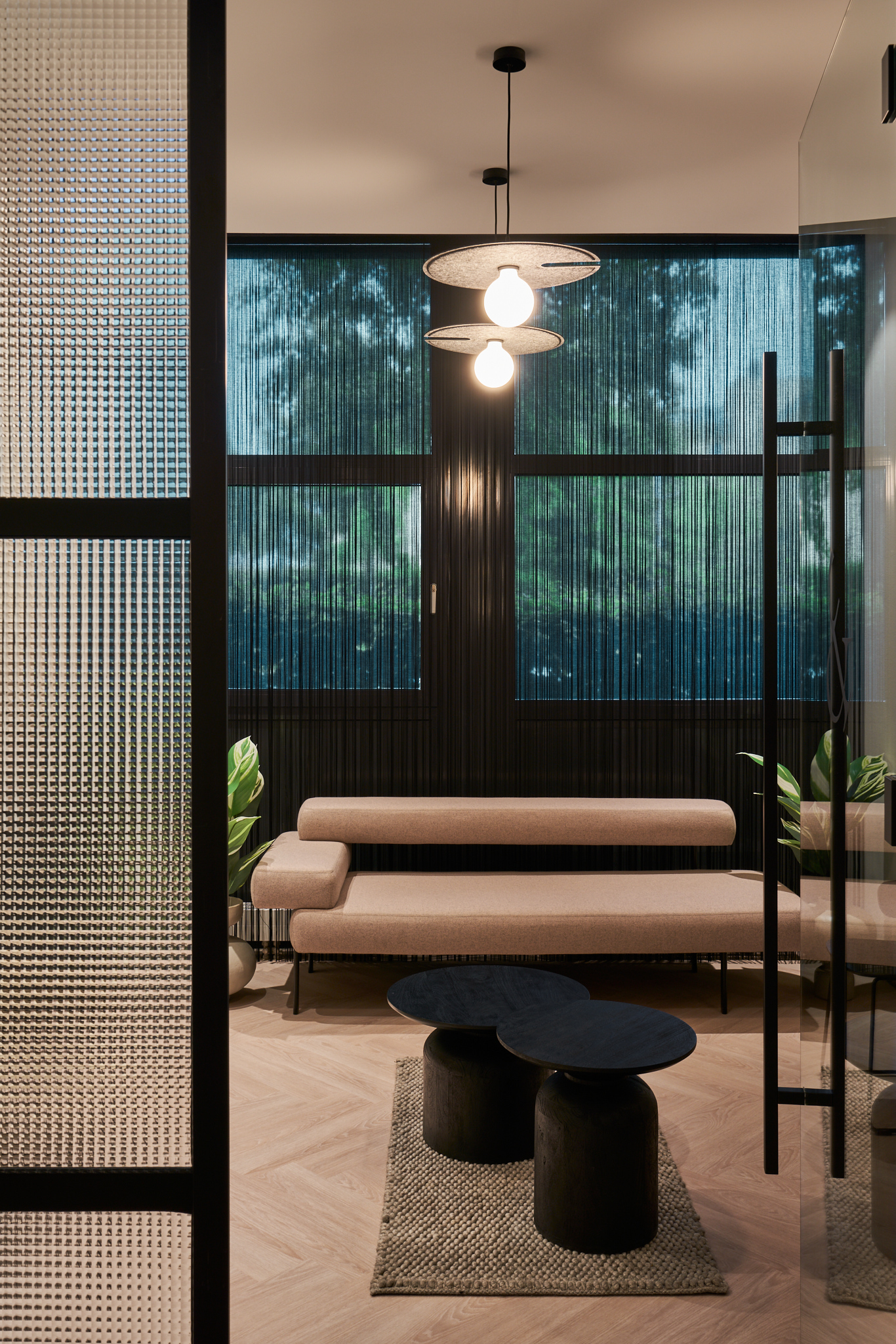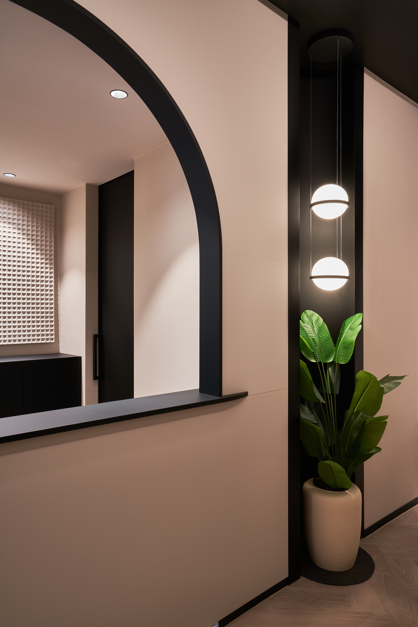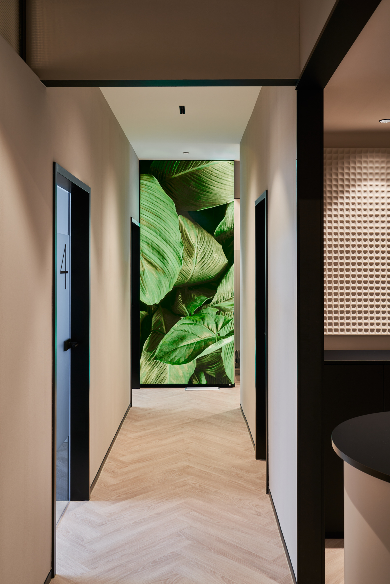 Kontrastierende schwarze Linien und geometrische Wandverkleidungen strukturieren den Raum und schaffen Tiefe. Ergänzt wird das Gesamtkonzept durch Pflanzen und ein hinterleuchtetes Blättermotiv.