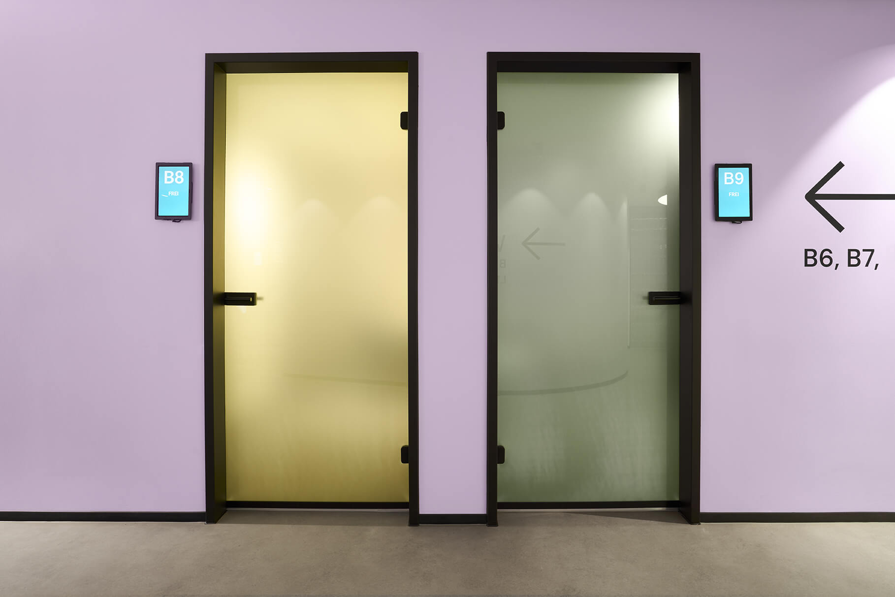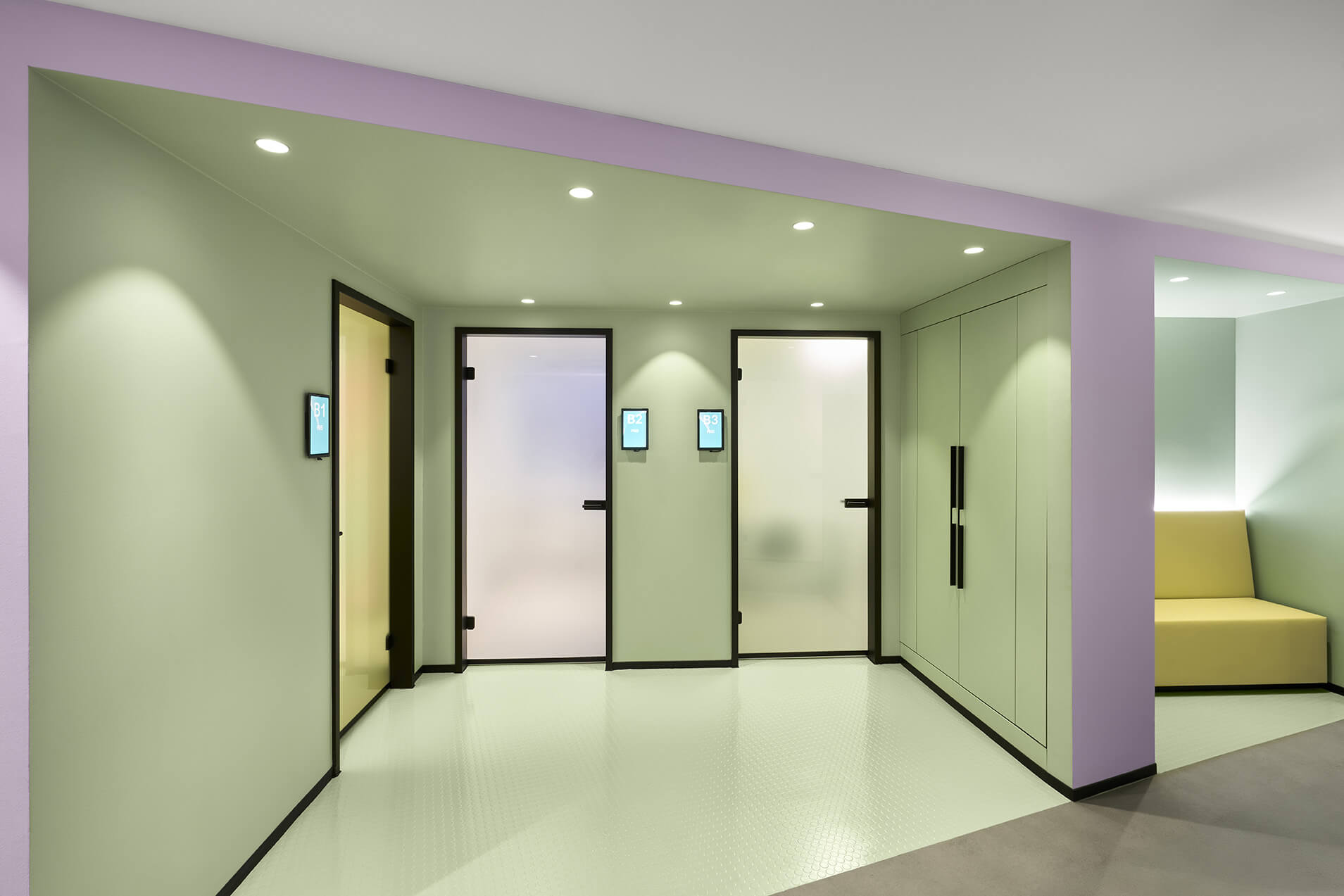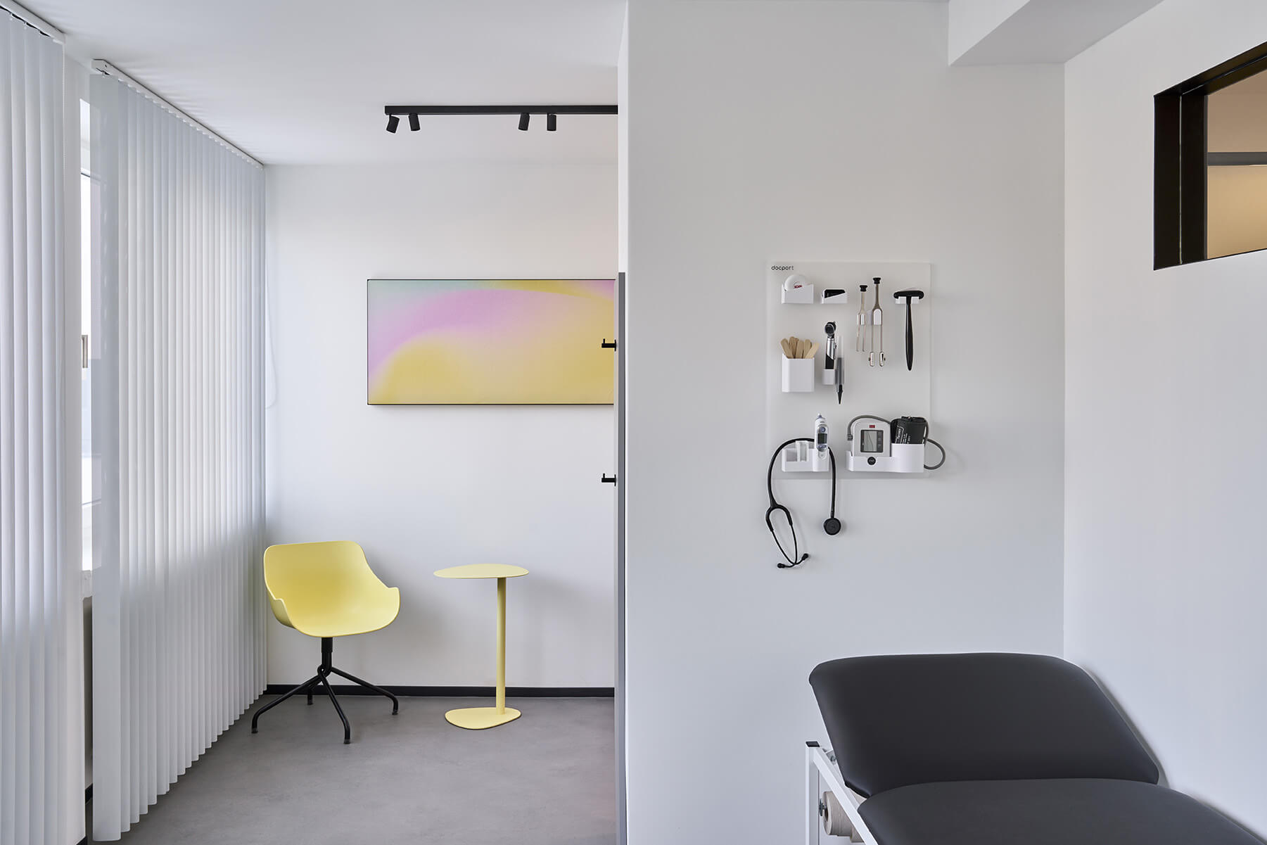 In den Behandlungszimmern wird diese Haltung reduziert fortgeführt: helle Flächen, Farbakzente und schwarze Elemente für Ruhe und Funktionalität.