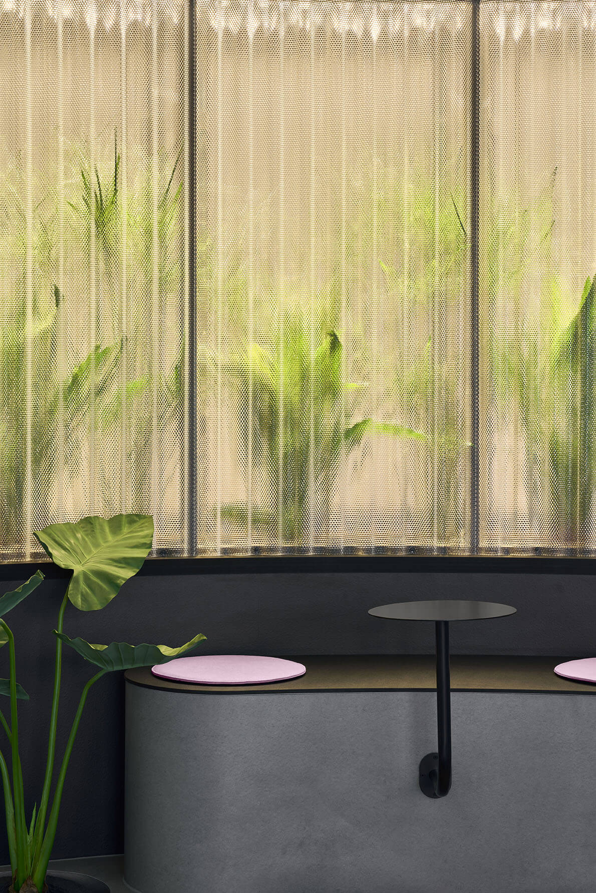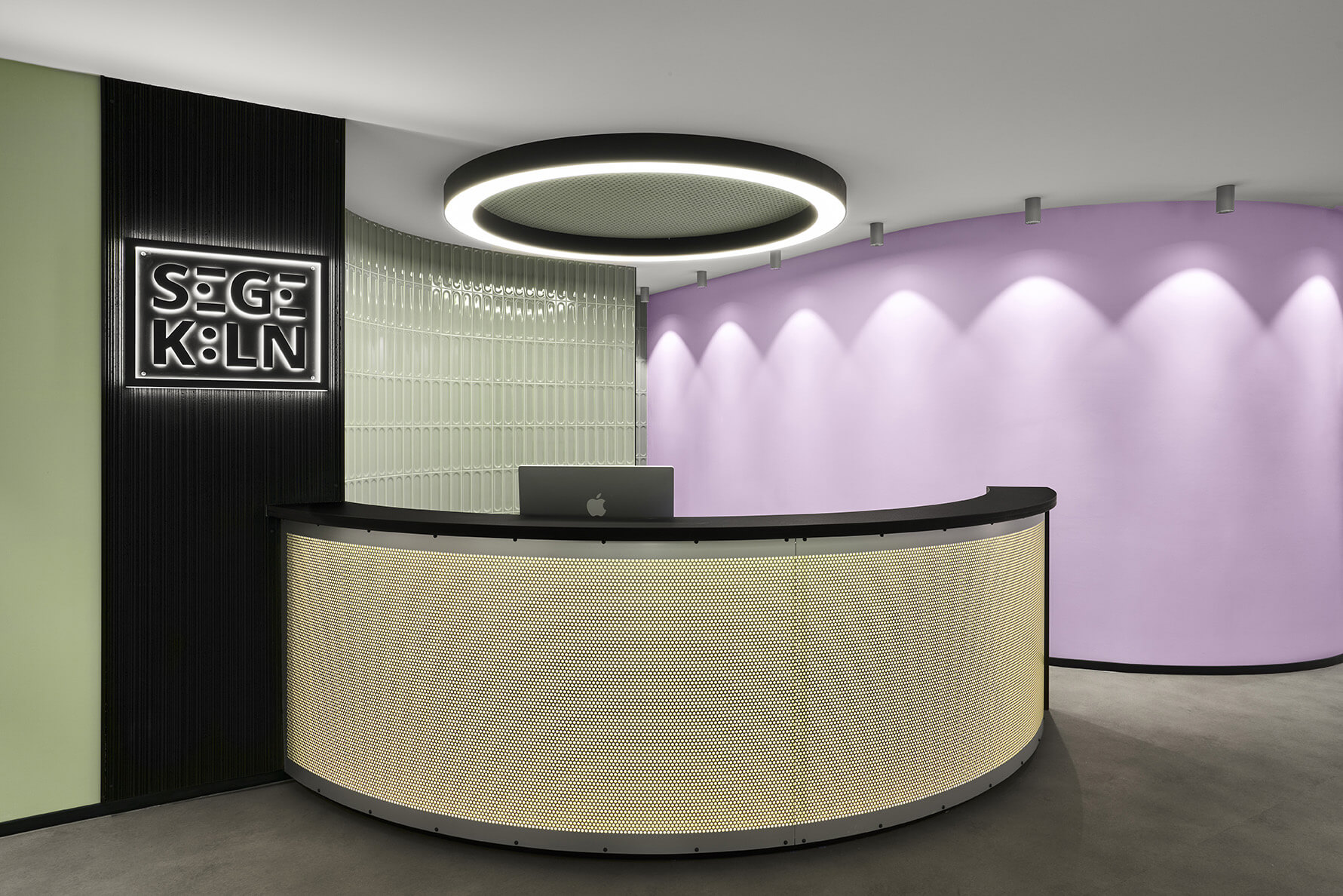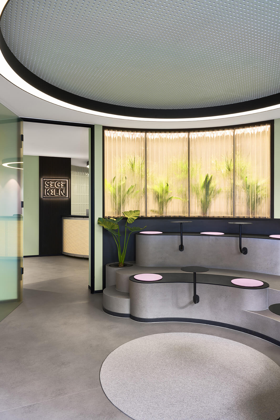 Empfang und Wartebereich sind als gerundete, einander gegenüberliegende Räume gestaltet. Der Wartebereich mit zweistufigem Podest, integrierten Sitz- und Tischflächen sowie einer doppelwandigen Pflanzenvitrine aus gewelltem Prismen-Acrylglas schafft Tiefe, Transparenz und Aufenthaltsqualität.