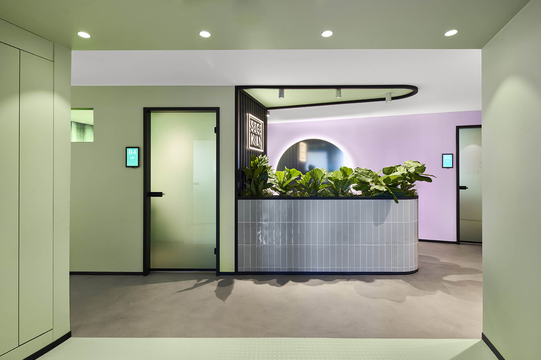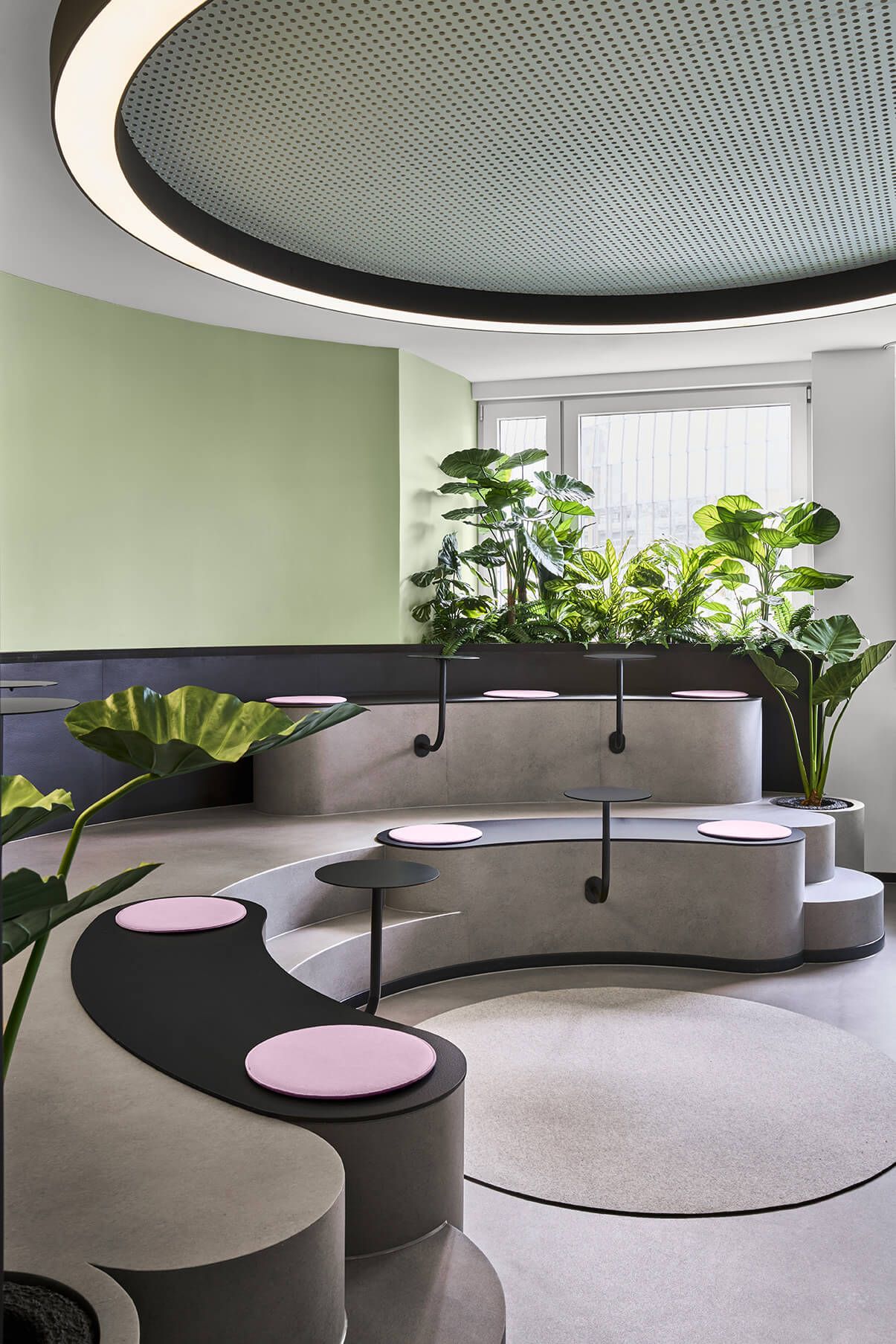 Das Farb- und Materialkonzept basiert auf pastelligen Abstufungen von Flieder, Mint und Gelb, geerdet durch einen grauen Boden in Betonoptik, schwarze Details als Kontraste sowie gewellte Strukturen, unterschiedliche Oberflächen und integrierte Pflanzflächen.